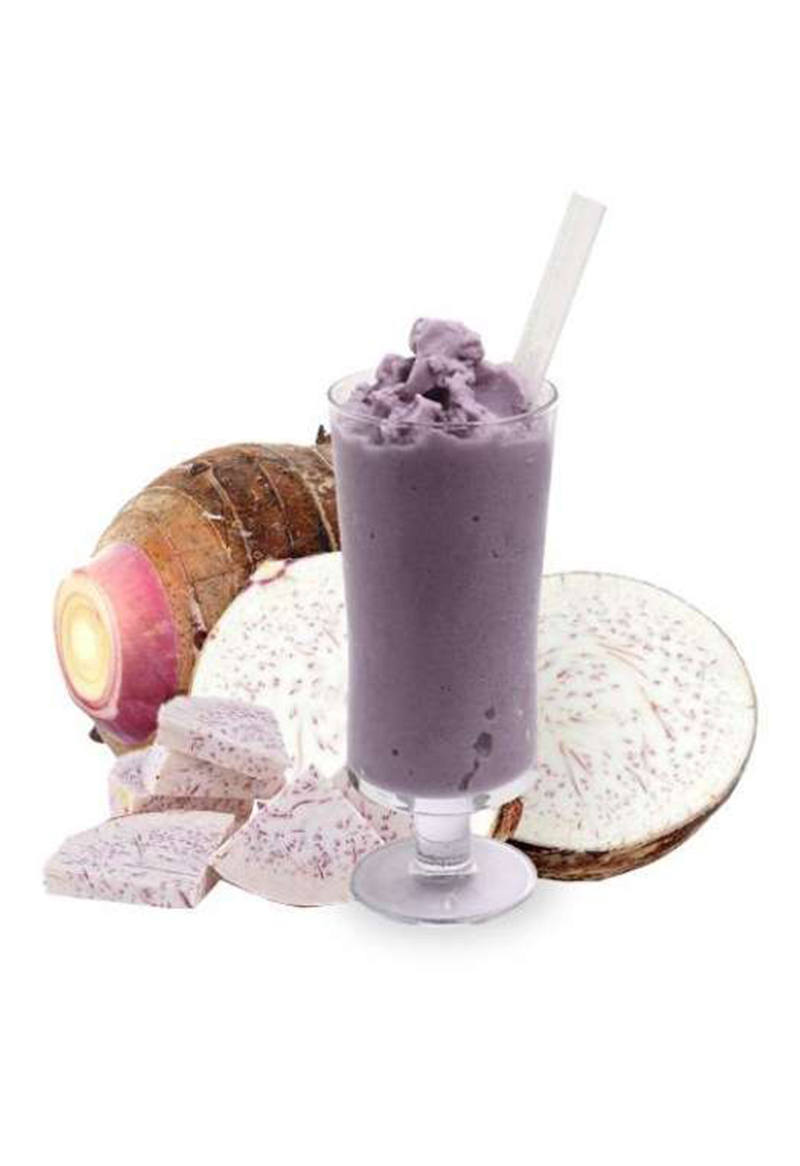 Taro flavored milk with caramel coating, best served with tapioca pearl.